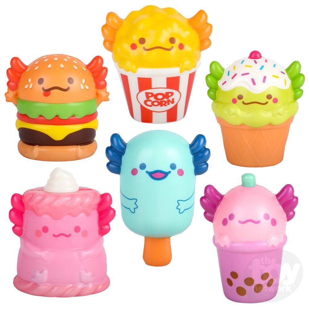 What a fun stress relief. The oh so popular animal friend, Axolotl in Foodie Form! Each piece of squishy, foamy food is topped with an axolotl head.