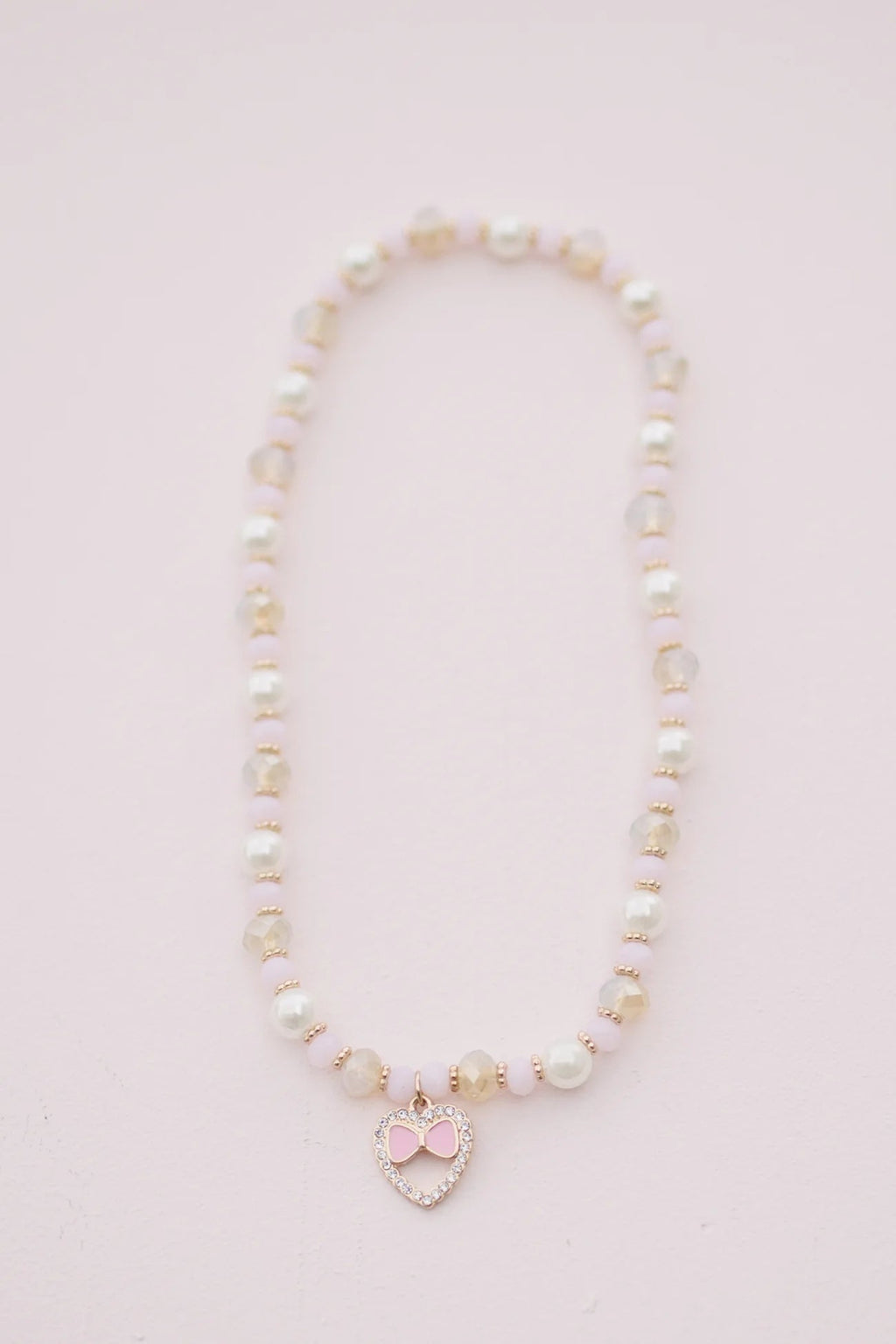 The BoutThe Boutique Love Necklace is one of our most elegant necklaces yet! Strung with pink, white, and gold beads and finalized with a rhinestone incrested heart & bow charm. This necklace is as sweet as can be!