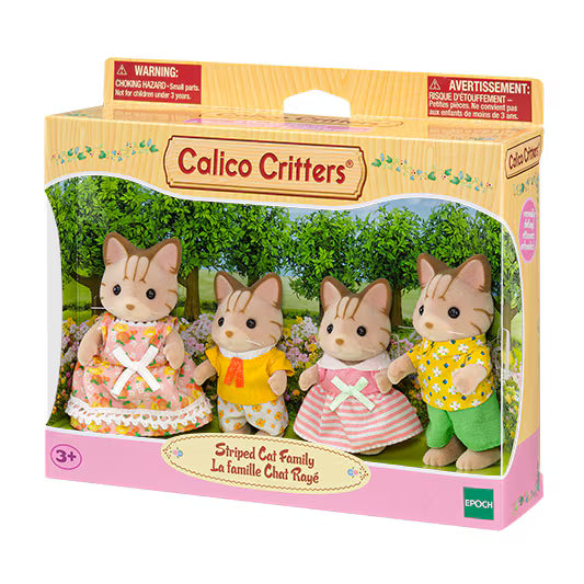 The Striped Cat family have a cute, stripy pattern. This set contains the father, mother, boy and girl. The fabric clothing can be removed to change their outfits.