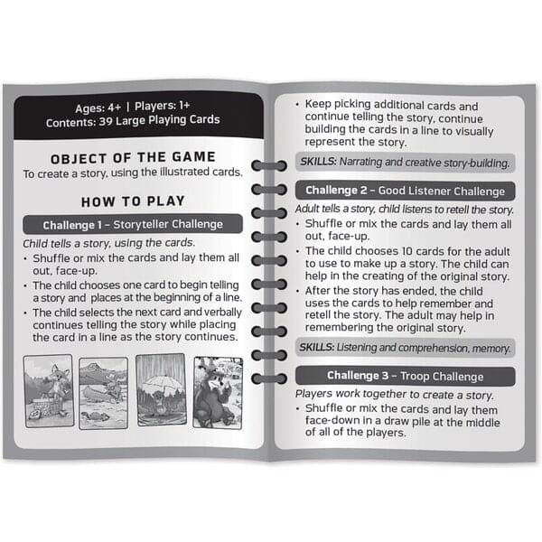 Gather around the campfire! Roast some marshmallows, and get ready to tell fantastic tales. Storytelling boosts creativity and encourages literacy…plus S’mores are yummy! The colorful illustrations of our Camping Vacation cards will inspire storytellers of all ages. Kids can entertain the family for an evening, or everyone can work together. No matter how you play, get silly and write your own story. Includes 39 playing cards and instructions.