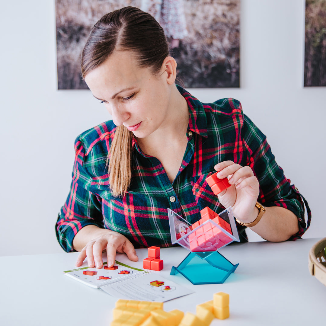 - Case that expands to be the game board, 8 red and 8 yellow 3D playing pieces, game rules, booklet with 80 challenges and solutions