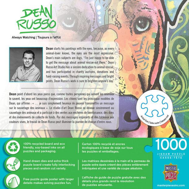 This MasterPieces 19.25" x 26.75" Dean Russo 1000 Piece Puzzle is the perfect blend of exciting and adorable. Such adorable eyes longing for his forever home. Dean Russo Art Studio has a sincere dedication to animal rescue, and has participated in charity auctions, donations and fund-raising events.