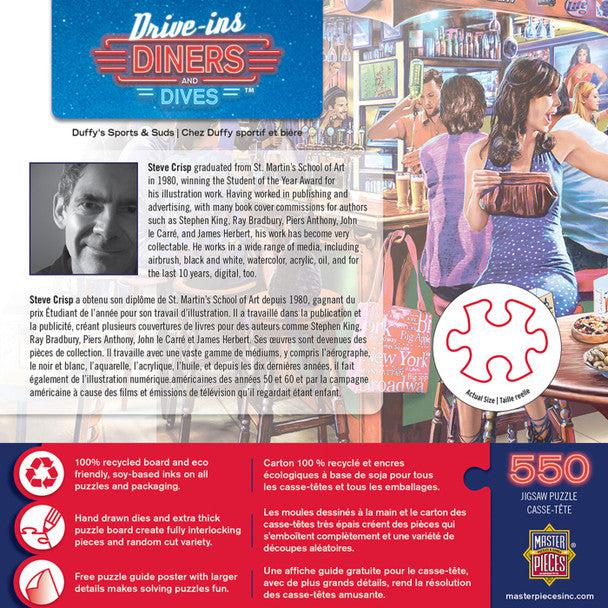 This MasterPieces 24" x 18" 550PC of Drive-Ins, Diners and Dives is a fun nostalgia puzzle. Everyone is welcome at the neighbor sports bar. Take yourself back to a simpler time where classic cars rules the road and be-bop on the airwaves. Classic Diners and Drive Ins still rules Friday night fun and even the occasional Dive. To reduce their impact on our environment, the chipboard used in these puzzles is made of recycled material.