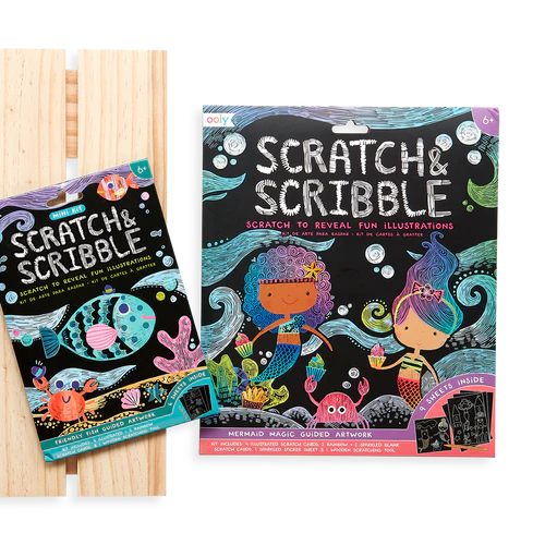 Scratch and scribble to find friendly fish hidden on scratch cards to show their rainbow hues. These ocean pals are easily revealed following the included guidelines of the 4 illustrated cards with the included wooden stylus. Create your own scratch art with 2 DIY blank cards. Everything you need is included in this friendly fish travel-sized scratch art kit.