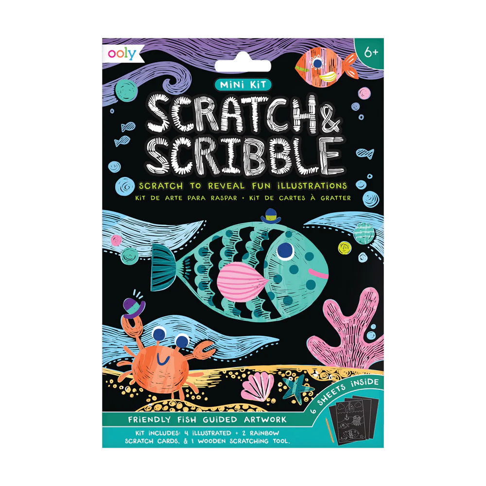- Travel sized scratch art kit with friendly fish