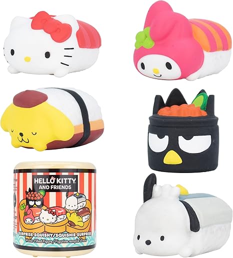 • [OFFICIALLY LICENSED SURPRISE SQUISHY] ♡ Open these adorable capsules for a super sweet Sanrio surprise! New Sanrio Sushi Roll Capsule Squishies feature Hello Kitty, Pompompurin, Pochacco, My Melody, and Badtz-maru as five different types of sushi!