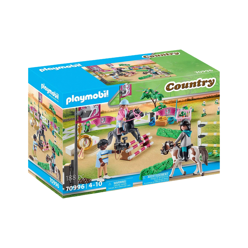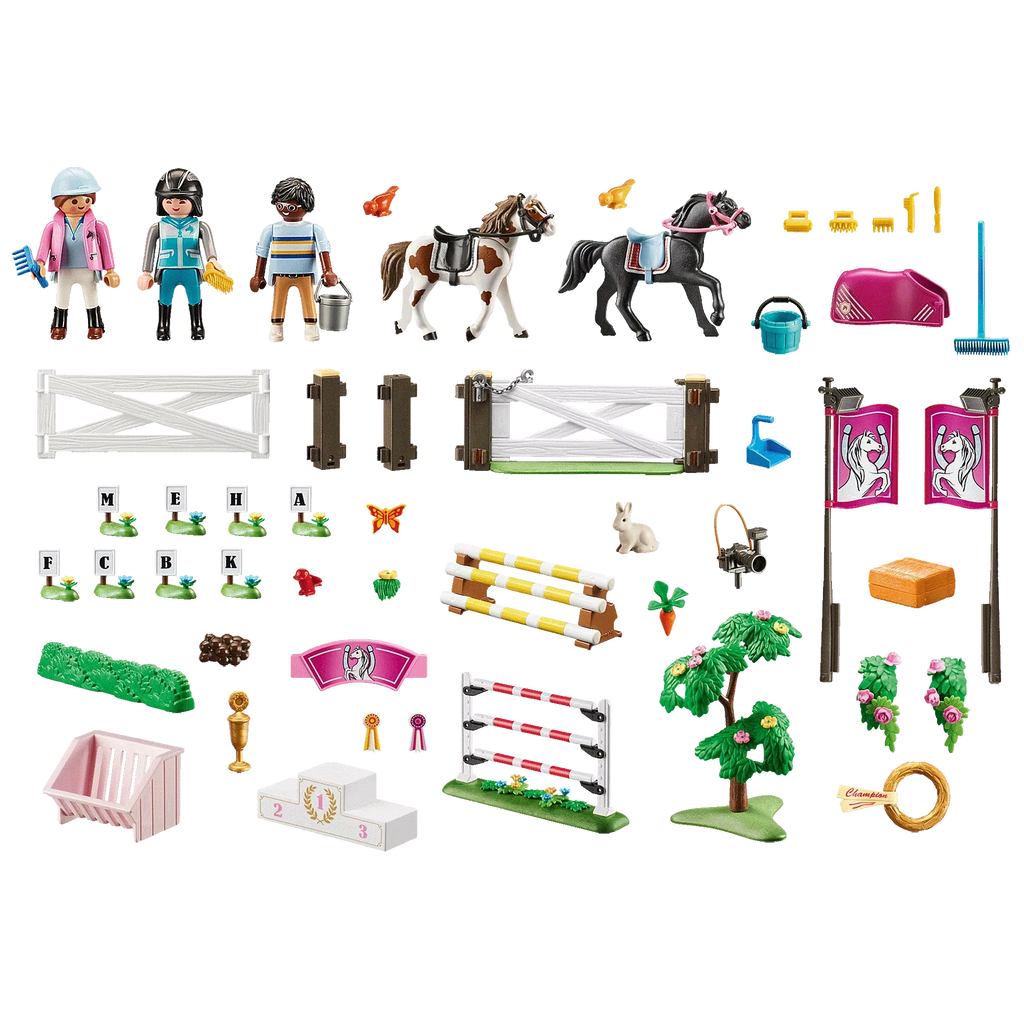 The horses get a post-tournament treat as well, thanks to the full feeding trough. The fence elements can be placed individually, while the included letter signs can be used to set up a dressage course. Set includes three figures, two horses, halters, riding jumps and obstacles, tournament ribbons, winner's podium, helmets, riding gear, and many other accessories.