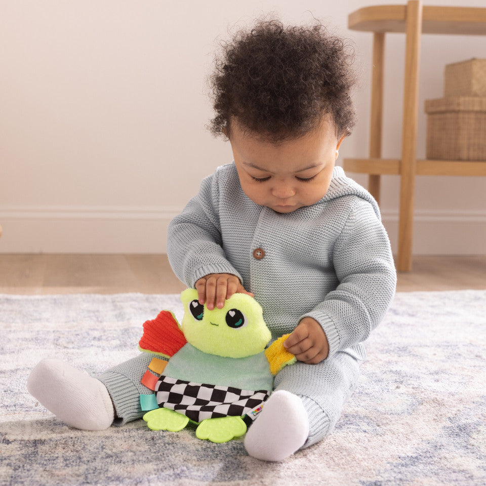 • Visual & Auditory Development: Bright colors, contrasting patterns, and an amusing crinkle noise when squeezed all join together to engage baby’s senses
