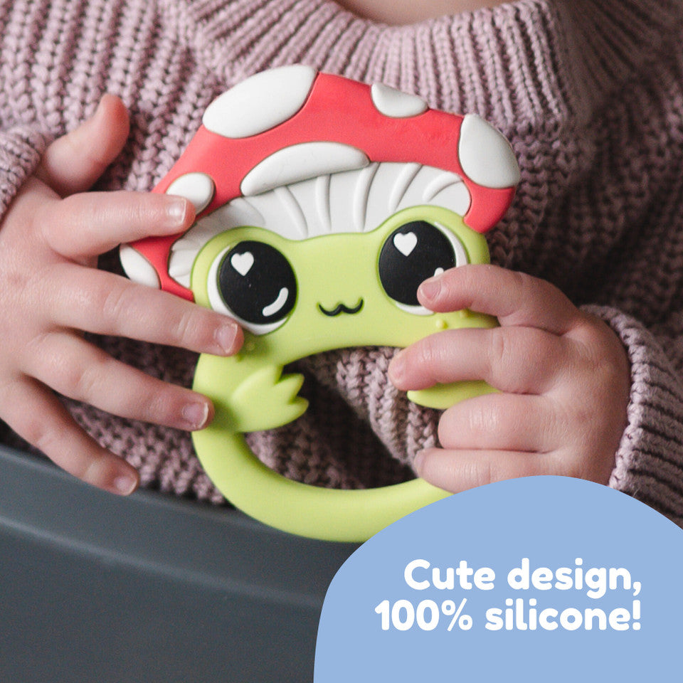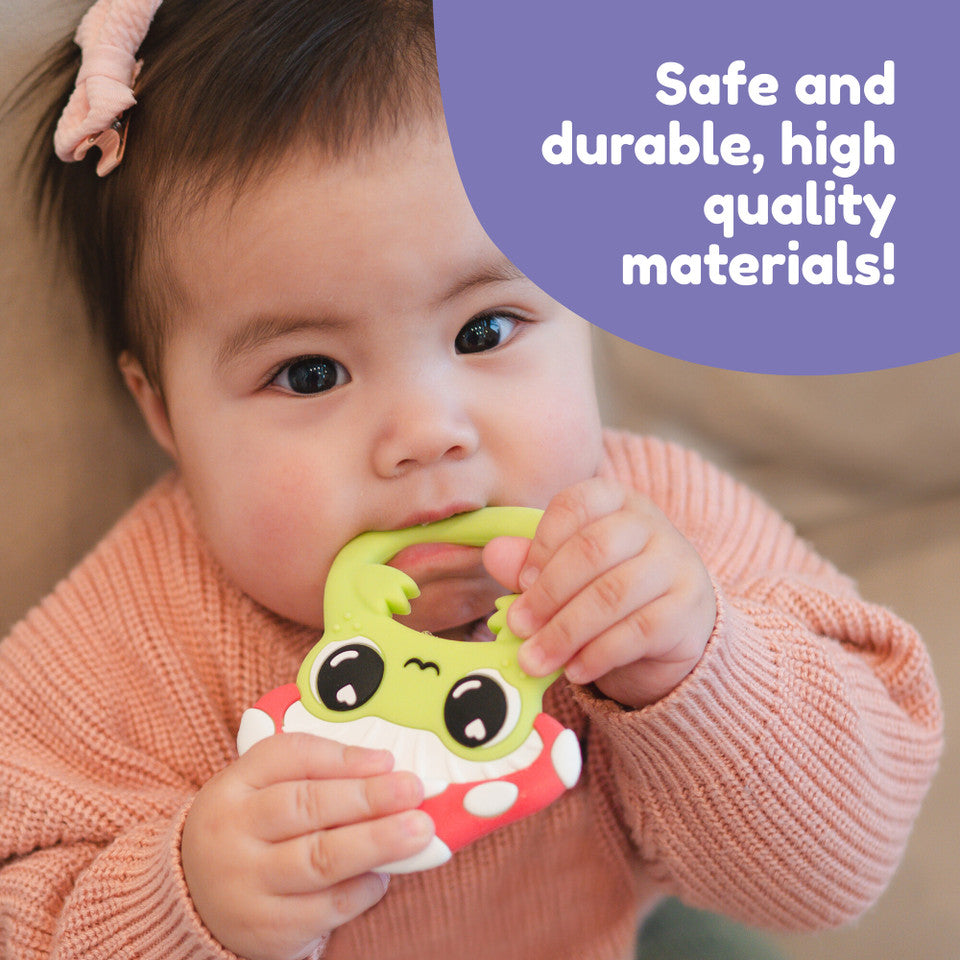 Leap into soothing relief with the Lamaze Finlee the Frog Silicone Teether. Featuring Finlee hiding playfully under a colorful mushroom, this baby teether is designed to engage the senses and provide soothing relief for sore gums. Finlee’s vibrant colors and textured surfaces encourage visual development and tactile exploration, while the easy-to-hold shape makes it simple for little hands to grasp. Made from durable, food-safe silicone, it’s perfect for both playtime and easing teething pain. The diaper bag friendly size makes it easy to take along for the ride, so Finlee will be ready to hop into action wherever you go!