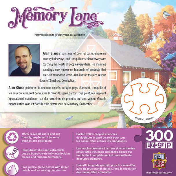 MasterPieces' 18" x 24" Memory Lane 300PC EZ Grip Puzzles are painted by the talented Alan Giana. The Memory Lane Collection Puzzle of Harvest Breeze illustrates a path leading to a big red barn. All the trees have started to change colors and the leaves are beginning to fall. It would lovely to take a seat in the white rocking chair featured and enjoy this beautiful fall day in the country.