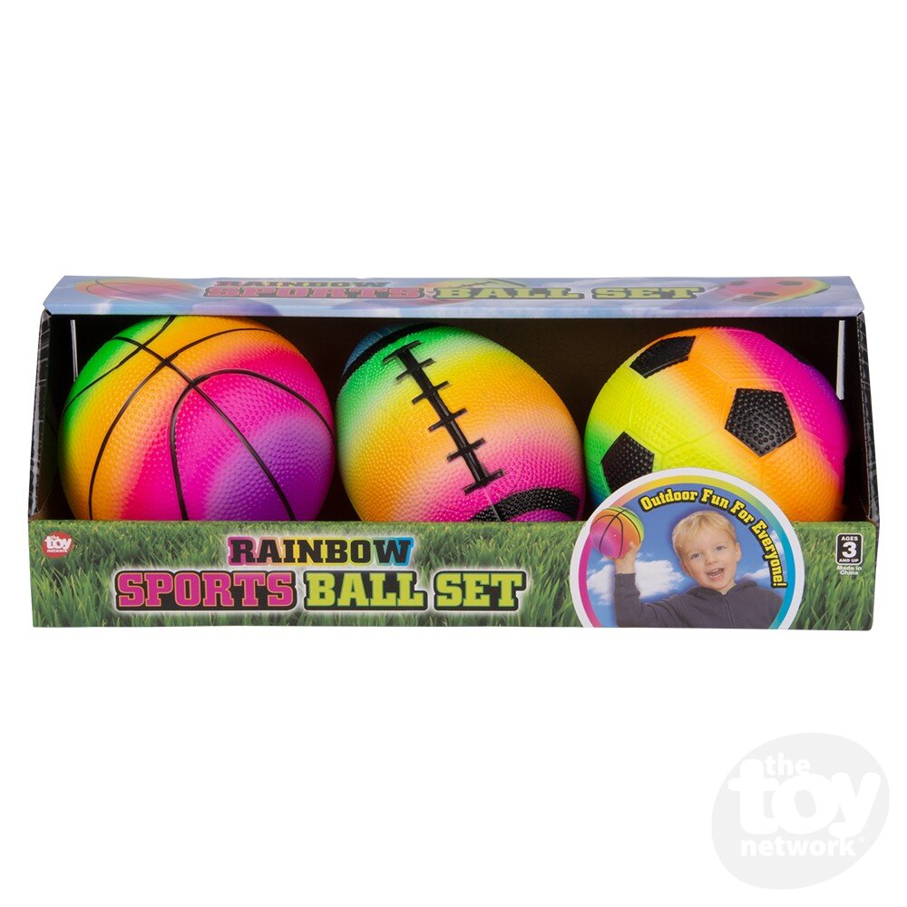 This Rainbow Sports Ball set features 3 different balls and is great for active play and practice. Each ball measures five to six inches.
