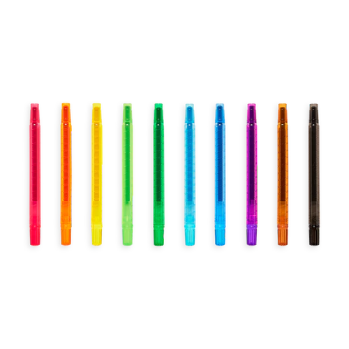 Color and draw with a set of twist up crayons that smell like unforgettably delicious fruit. Yummy Yummy scented twist-up crayons are a set of 10 scented crayons encased in a plastic barrel; just give it a twist when you need more crayon to color with. The durable barrels are a great way to keep little hands clean and protect your crayons from accidental breakage.