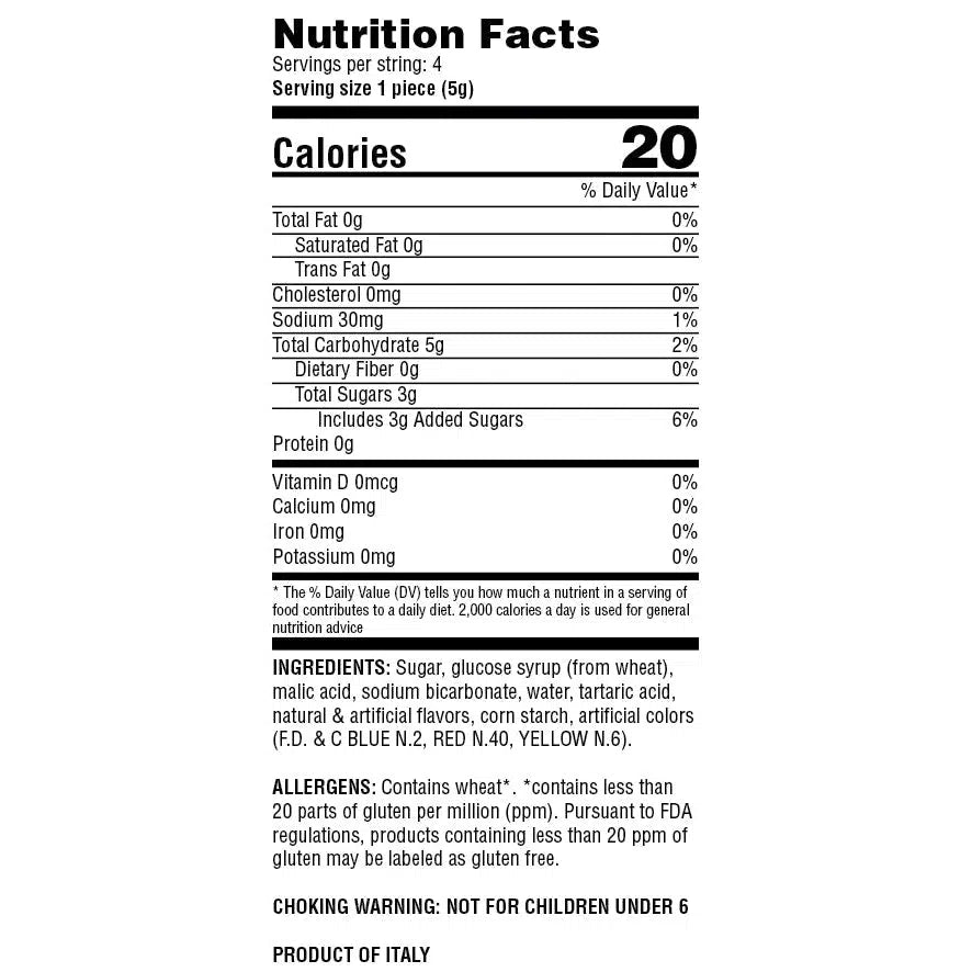 Sour, fizzy candy strings with fruitful flavors such as blue raspberry, orange and grape are a sure way to get your tastebuds tingling. Delicious foaming as it melts in your mouth, these candy strings are perfect for a little pop of zing.